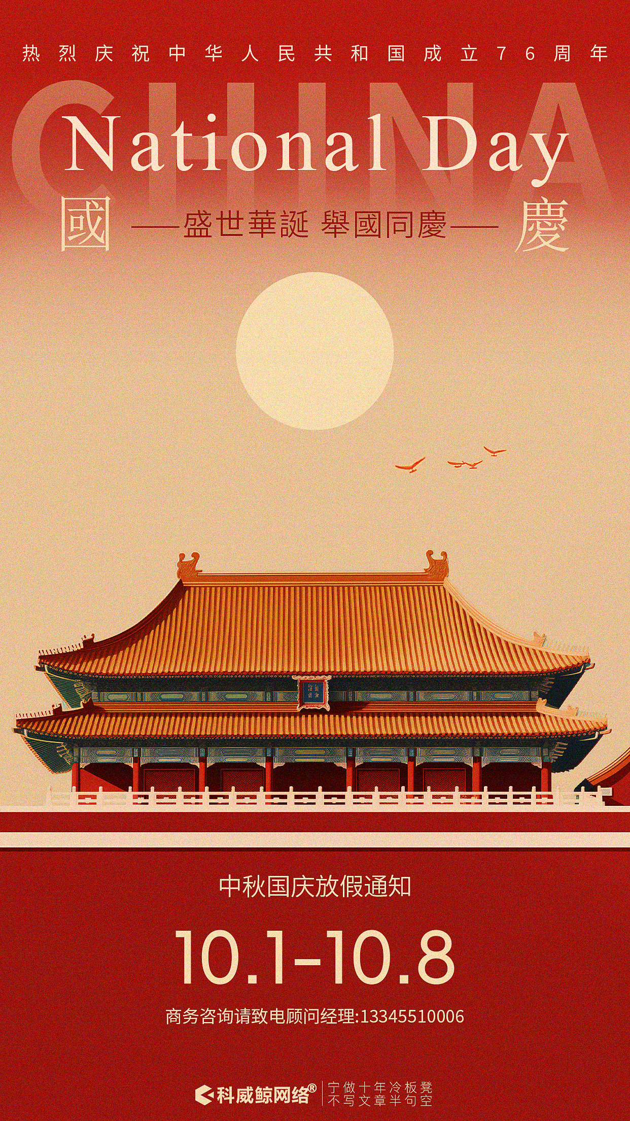 金秋送爽,家国同庆。值此国庆与中秋双节来临之际,我们科威鲸网络谨向您致以最诚挚的节日问候!感谢您长期以来的信任与支持,正是这份携手同行的默契,让我们得以稳步成长。